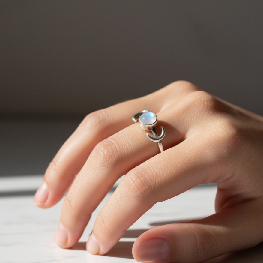 Piedra: Piedra Luna. Cada piedra es única, por eso la piedra puede ser ligeramente diferente a las fotos y de una joya a otra.